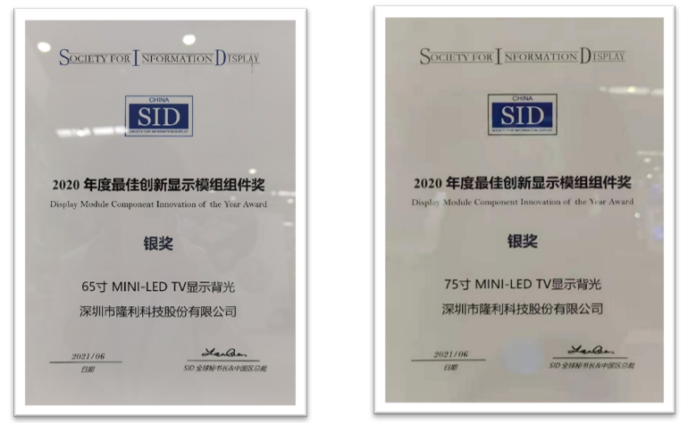 會(huì )議期間,國際信息顯示學(xué)會(huì )(SID)對全球領(lǐng)先的顯示技術(shù)與產(chǎn)品進(jìn)行了表彰。隆利科技研發(fā)的65寸和75寸Mini-LED背光顯示模組產(chǎn)品憑借精湛的制作工藝和創(chuàng )新性的設計理念獲得專(zhuān)家評審組的認可,雙雙獲評“2021年度最佳創(chuàng )新顯示模組組件獎-銀獎”。
