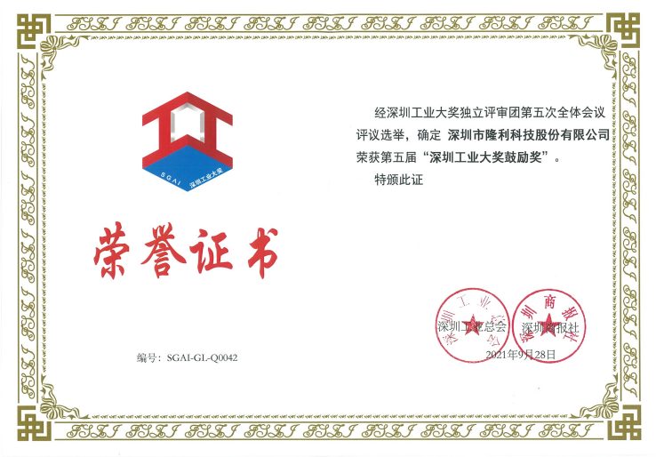 2021年9月28日在深圳國際會(huì )展中心召開(kāi)的第十五屆五洲工業(yè)發(fā)展論壇上,隆利科技榮獲深圳工業(yè)大獎鼓勵獎。