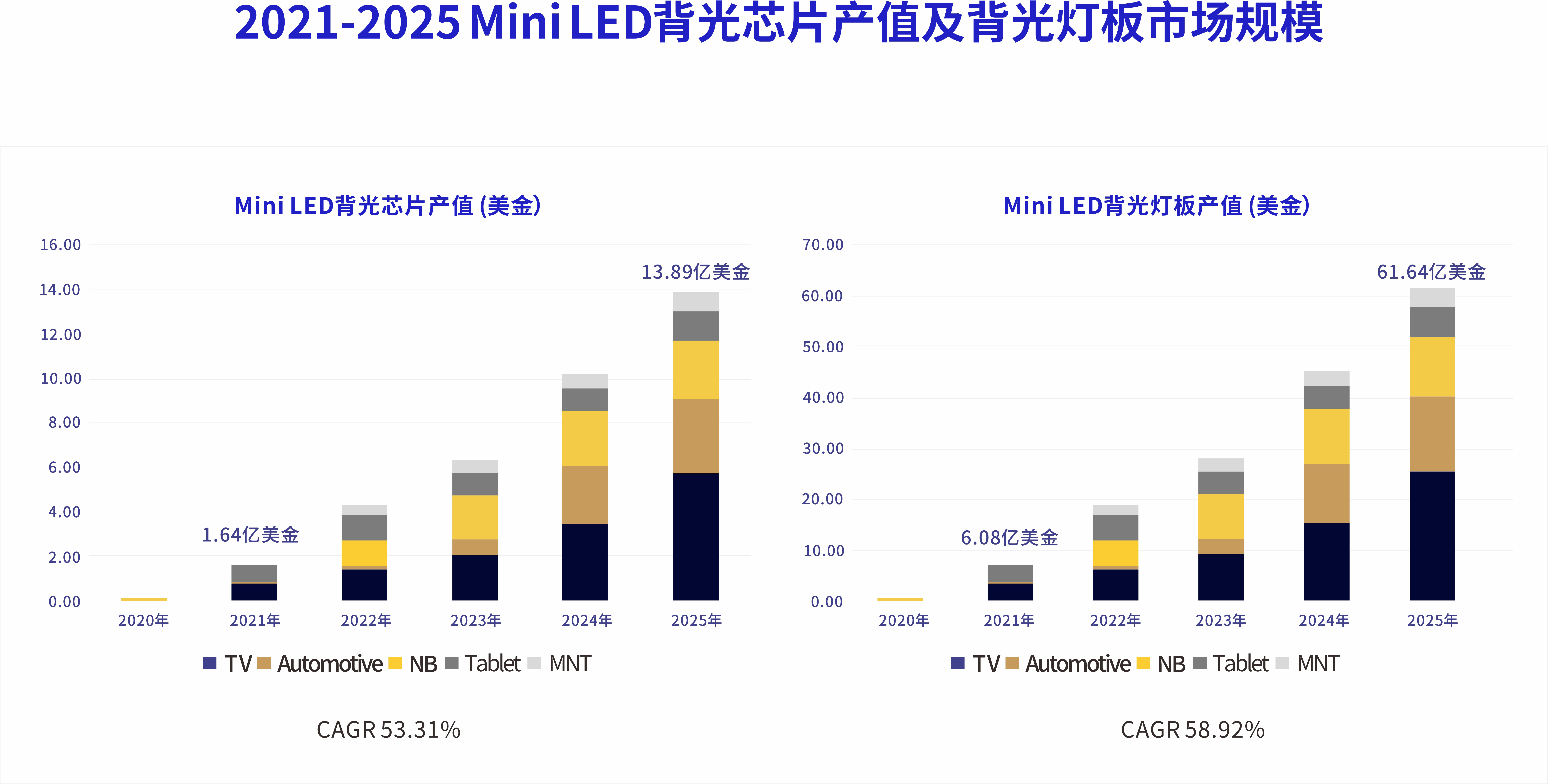 在終端產(chǎn)品頻頻發(fā)布的同時(shí),產(chǎn)業(yè)鏈上下游積極響應,Mini LED背光產(chǎn)品有望進(jìn)一步放量。據行家Research預測,至2025年,Mini LED背光芯片總產(chǎn)值將達到13.98億美金,Mini LED背光燈板產(chǎn)值將達到61.64億美金?;趯舭孱A測,可以推知,Mini LED背光模組的產(chǎn)值約有百億。